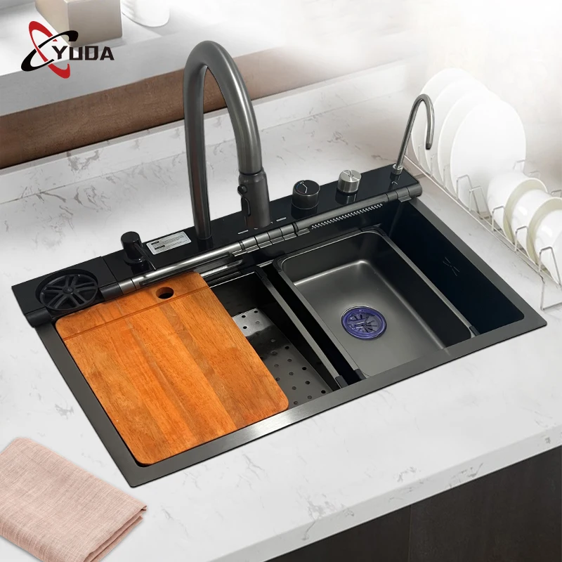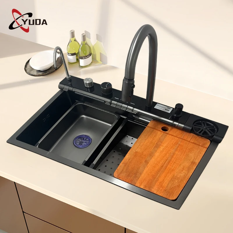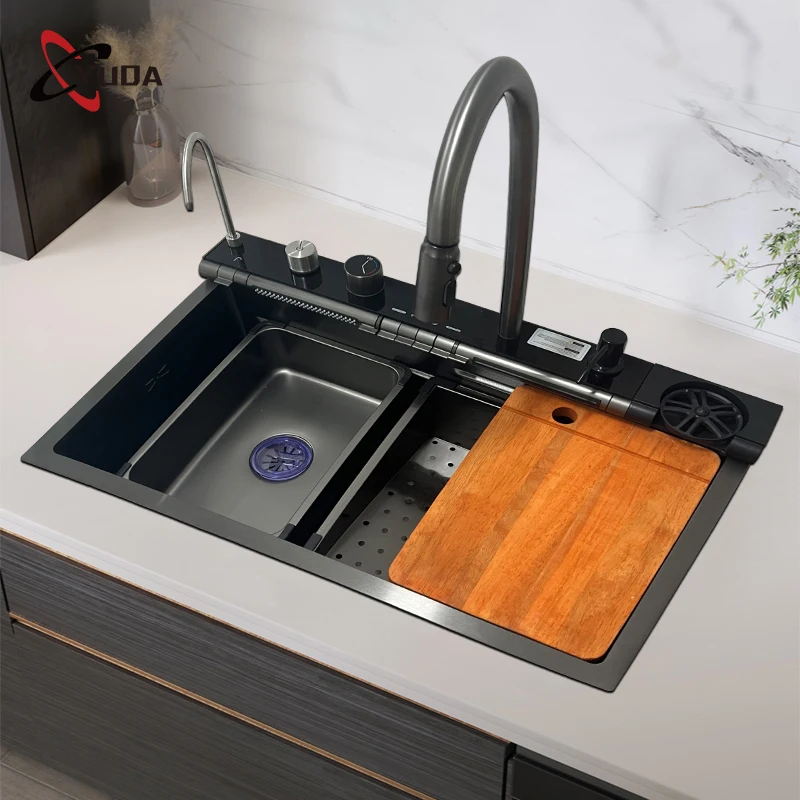 Designed for modern kitchens, this premium 304 stainless steel sink features a sleek nano-black finish that resists corrosion and stains. The spacious single-bowl design incorporates a waterfall workstation, enhancing efficiency for food preparation and cleanup. Its durable, above-counter construction offers a sophisticated aesthetic while providing long-lasting performance in busy residential or commercial environments.